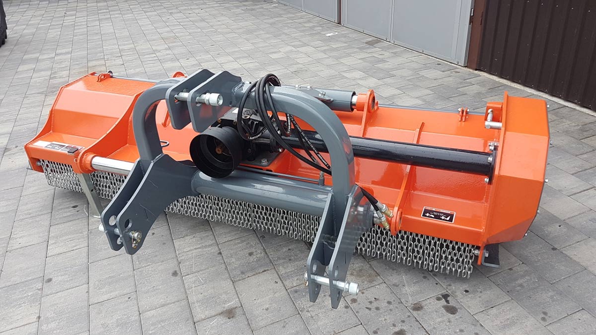 Kompakten mulčer za vinograde in sadovnjake, nameščen na zadnjem delu traktorja, primeren za mulčanje trave, goste vegetacije in grmovja premera od 6-7 cm. Standardna oprema: 3-točkovni priklop, kategorija II, stranske sani, nastavljiva višina kosilnice od 2 cm do 4 cm in 6 cm, hidravlični stranski pomik (3 načini nastavitve), samočistilni izravnalni valj, kardanska gred, hidravlično dvigovanje zadnjega pokrova, kovani in kaljeni kladivni noži Mateng.